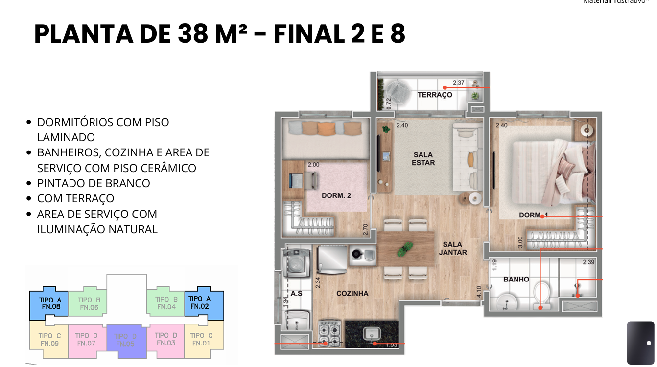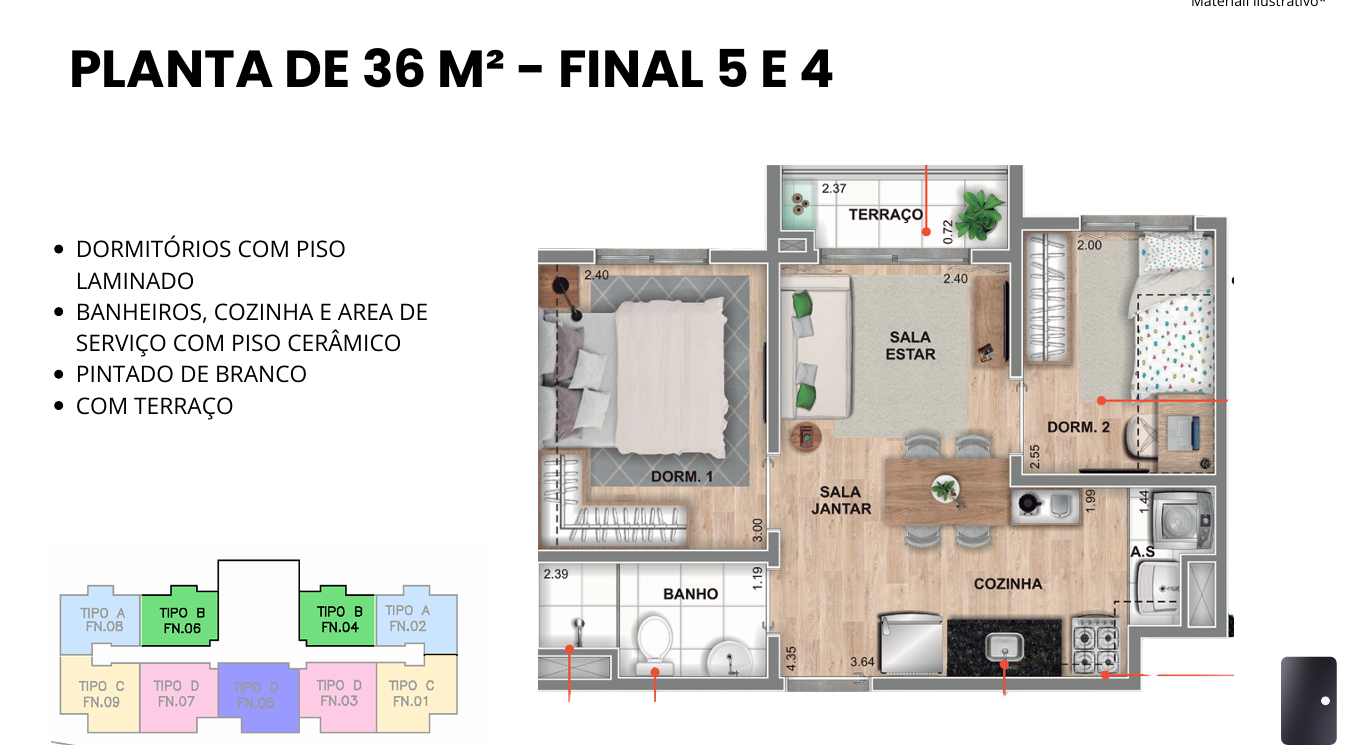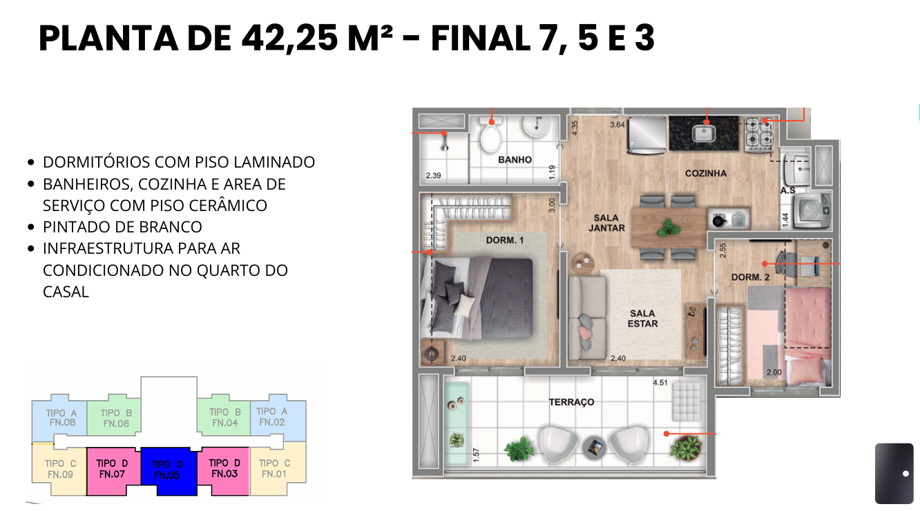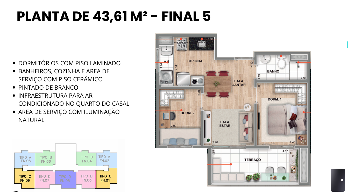 • Banheiro, área de serviço e terraço entregues com piso cerâmico