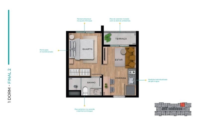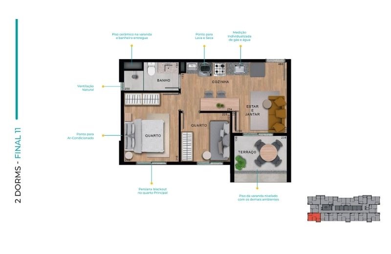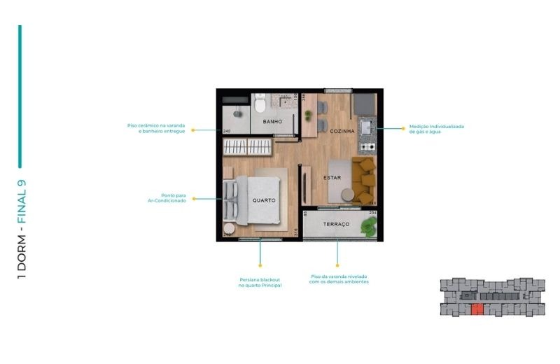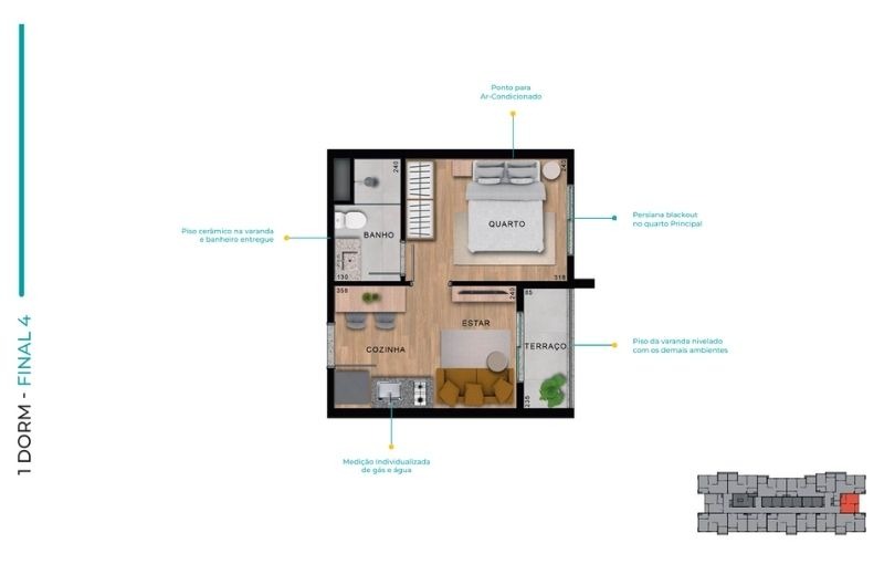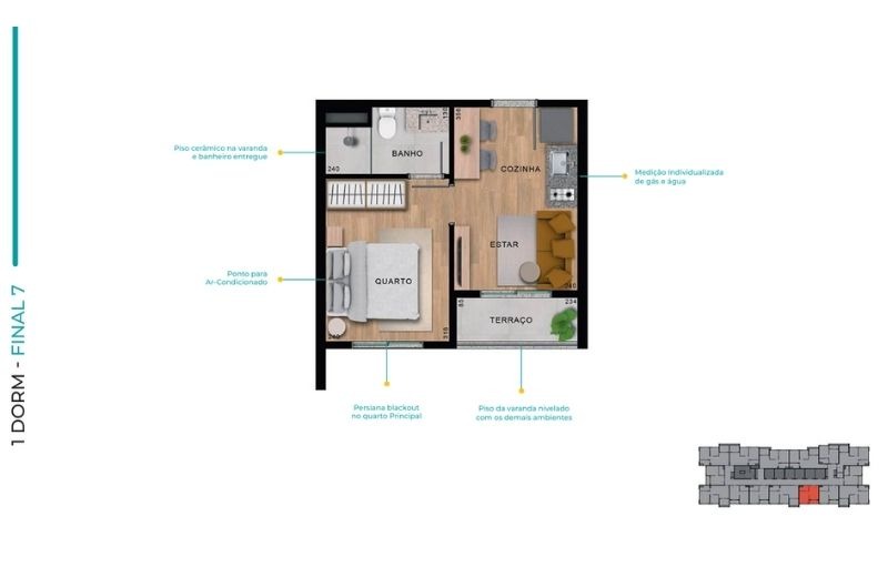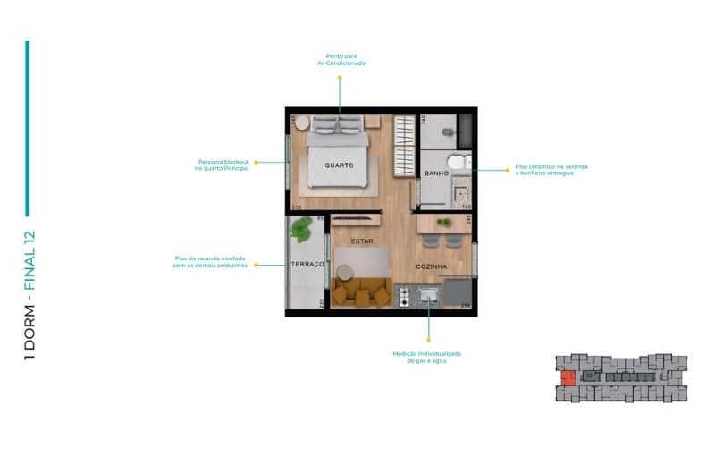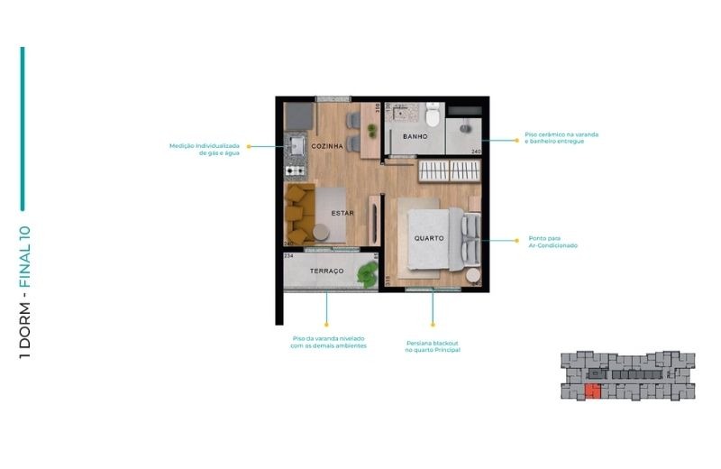 Com apartamentos de 1 dormitório (24m²) e 2 dormitórios (de 37 a 41m²), com opções com ou sem vaga, o projeto traz plantas inteligentes, varanda em todas as unidades e infraestrutura para ar-condicionado.