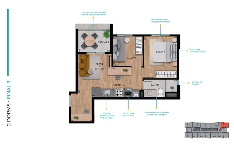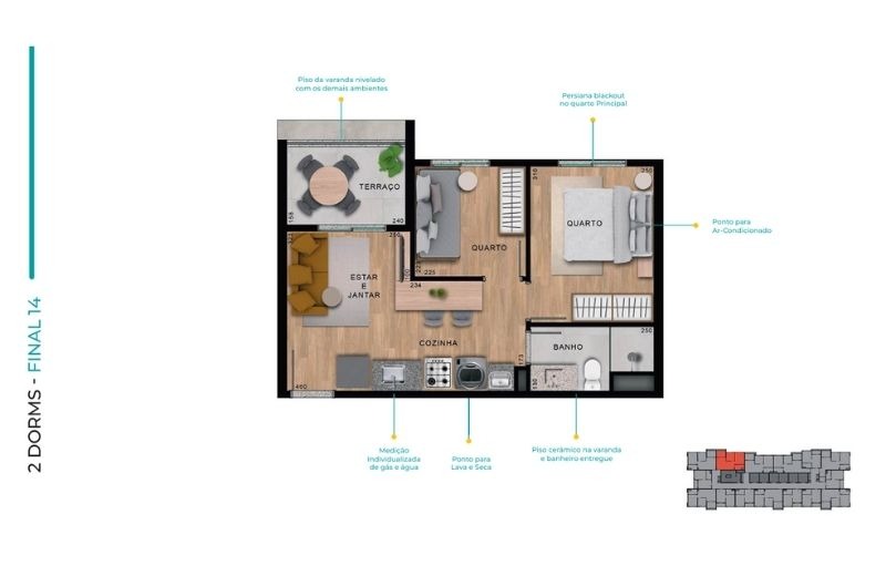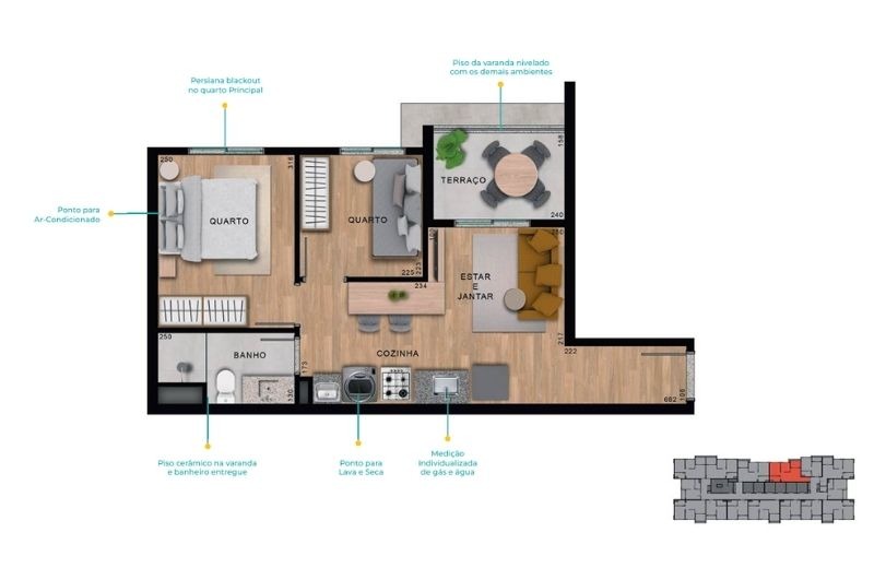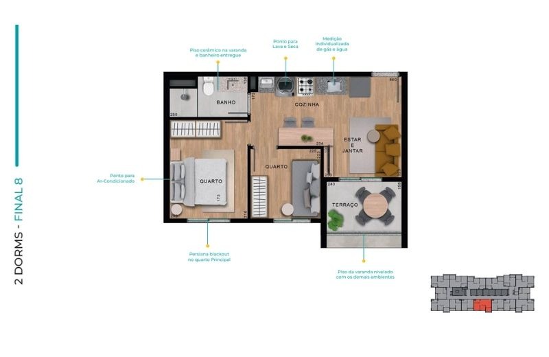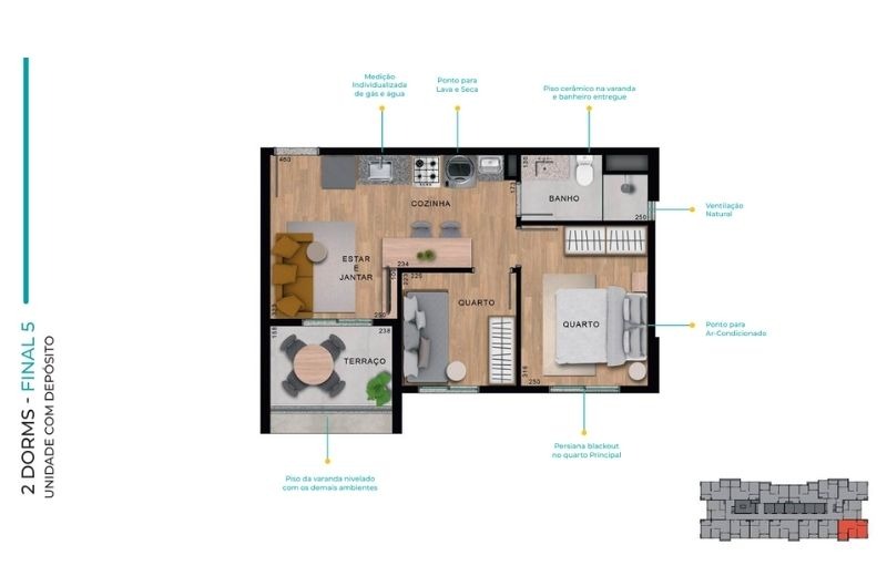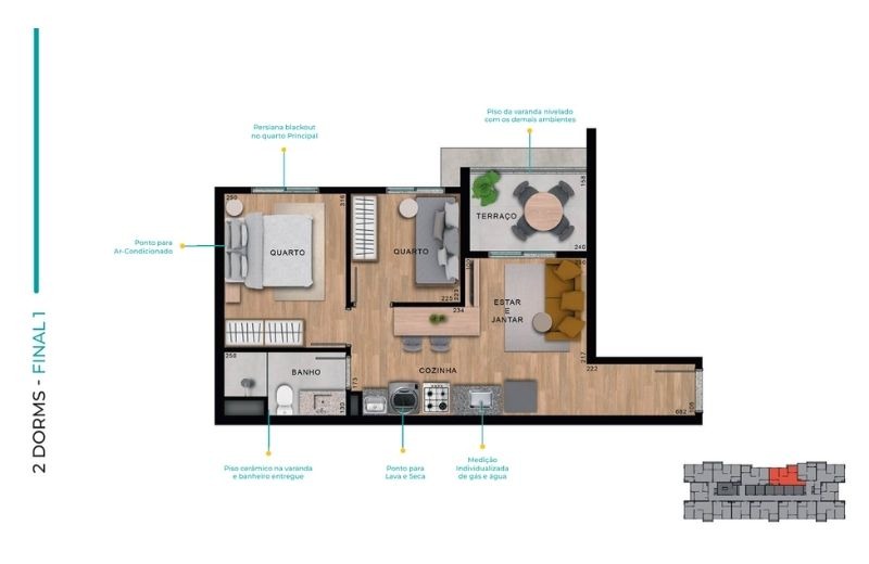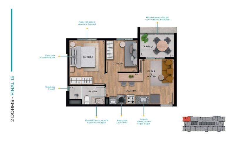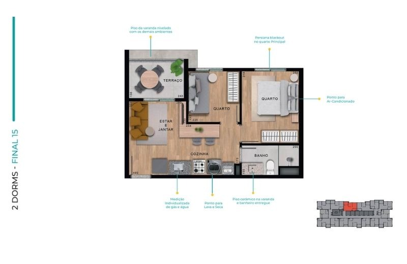 Com apartamentos de 1 dormitório (24m²) e 2 dormitórios (de 37 a 41m²), com opções com ou sem vaga, o projeto traz plantas inteligentes, varanda em todas as unidades e infraestrutura para ar-condicionado.